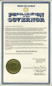 “We are extremely pleased with Governor Kelly’s proclamation, which highlights the importance of breastfeeding support for families in Kansas,” Brenda Bandy, IBCLC, Executive Director of the Kansas Breastfeeding Coalition (KBC), said. “This proclamation supports their decision and fosters a landscape of breastfeeding support in our state for the benefit of Kansas children and families.”